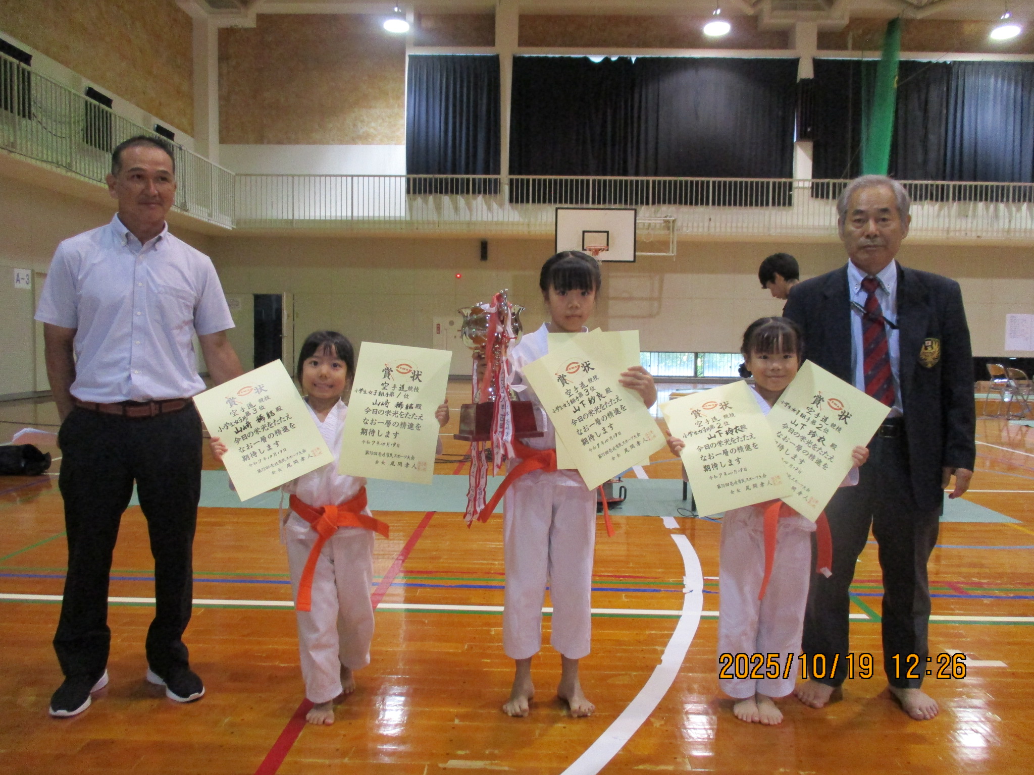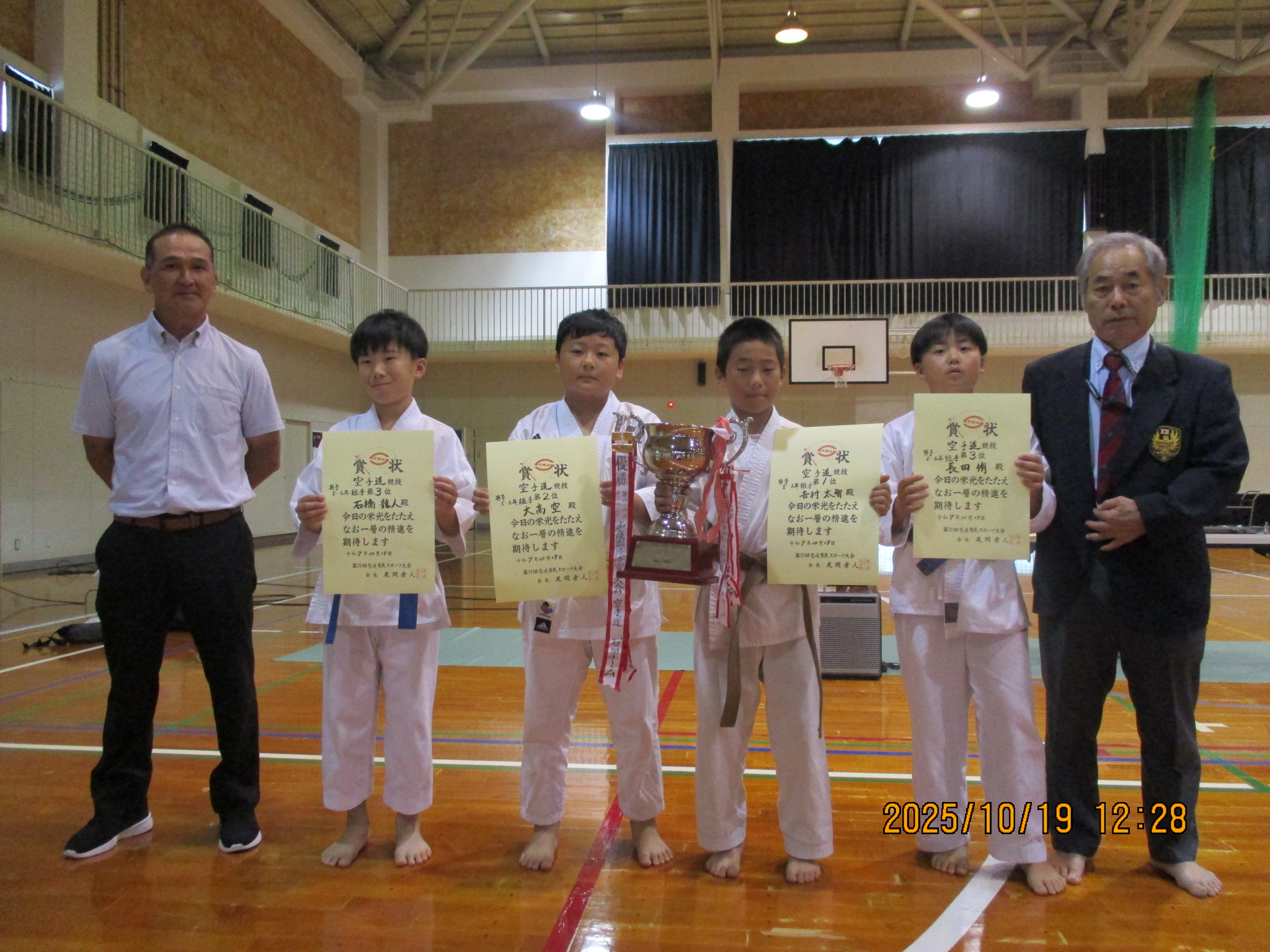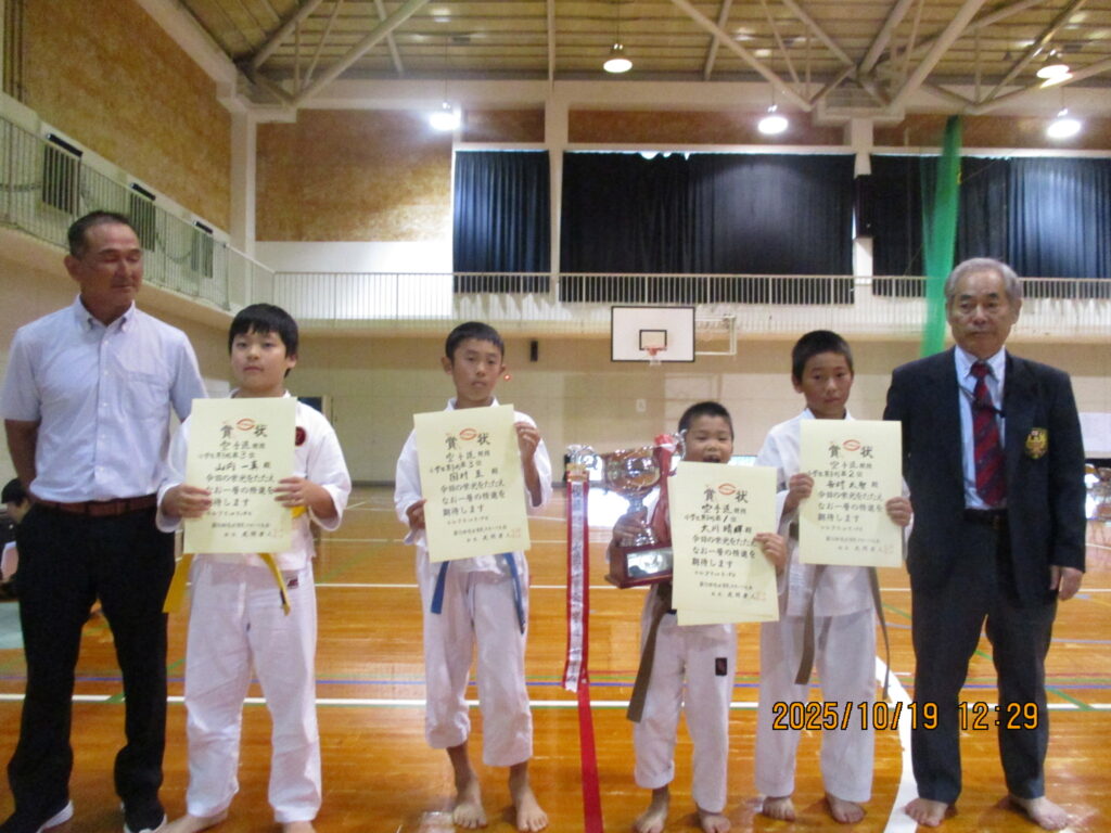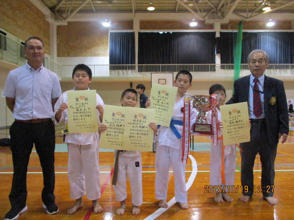 2025.10.19 空手日記 10.19,グラウンドでの総合開会式 小学生女子、学年別男子、形と組手入賞者の生徒と、空手連盟会長と私で記念撮影 Post Share LINE note 投稿者: admin 空手日記 10.5,鳥居を見上げ気合が入る若者! 本殿前の特設さ…前の記事 10.31,博多港の飛鳥次の記事