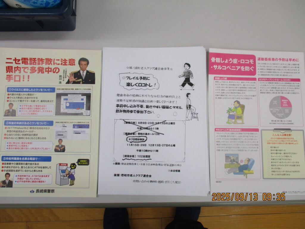 9.13,楽しくロコトレ、この会場は今回で最後、ここでも振り込め詐欺防止のチラシを配布 *前日のスポーツ大会参加者も出席され元気一杯、外出が出来ない人、体を動かす機会が少ない高齢者対策が課題! Post Share LINE note 9.8,久しぶりのサロン、体操と振り込め詐欺防止の資料…前の記事 10.10,はつらつ元気塾、1時間半の講義なので話題も…次の記事